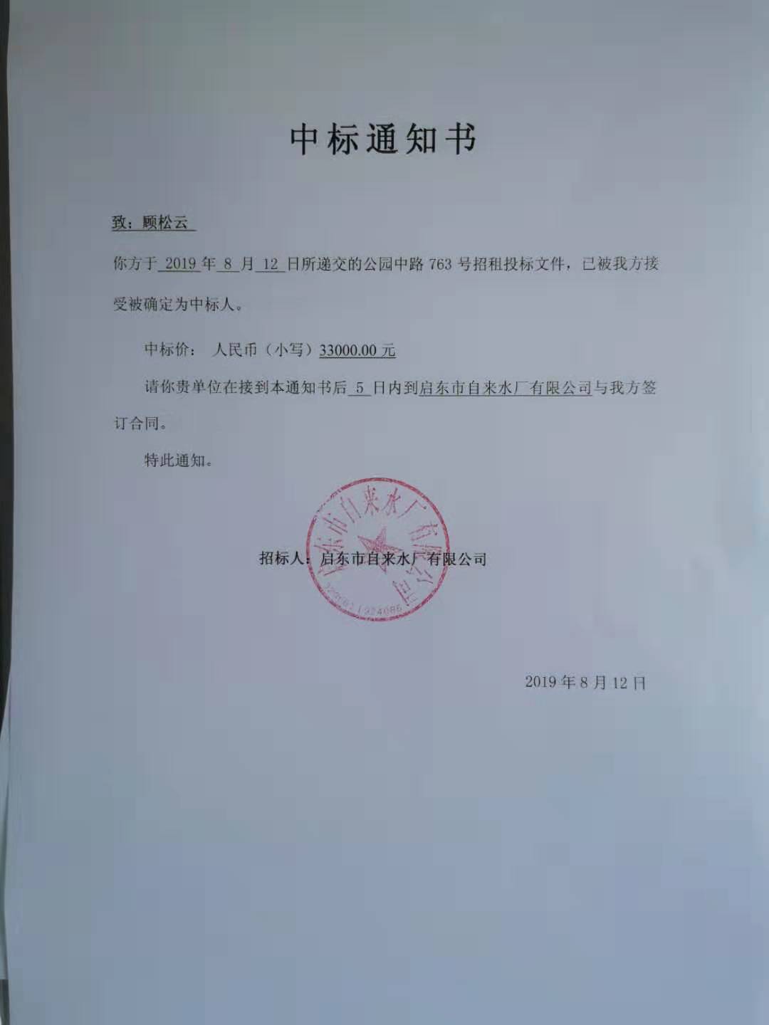 公園中路802號綜合樓南3及公園中路763號后房屋招租中標通知書