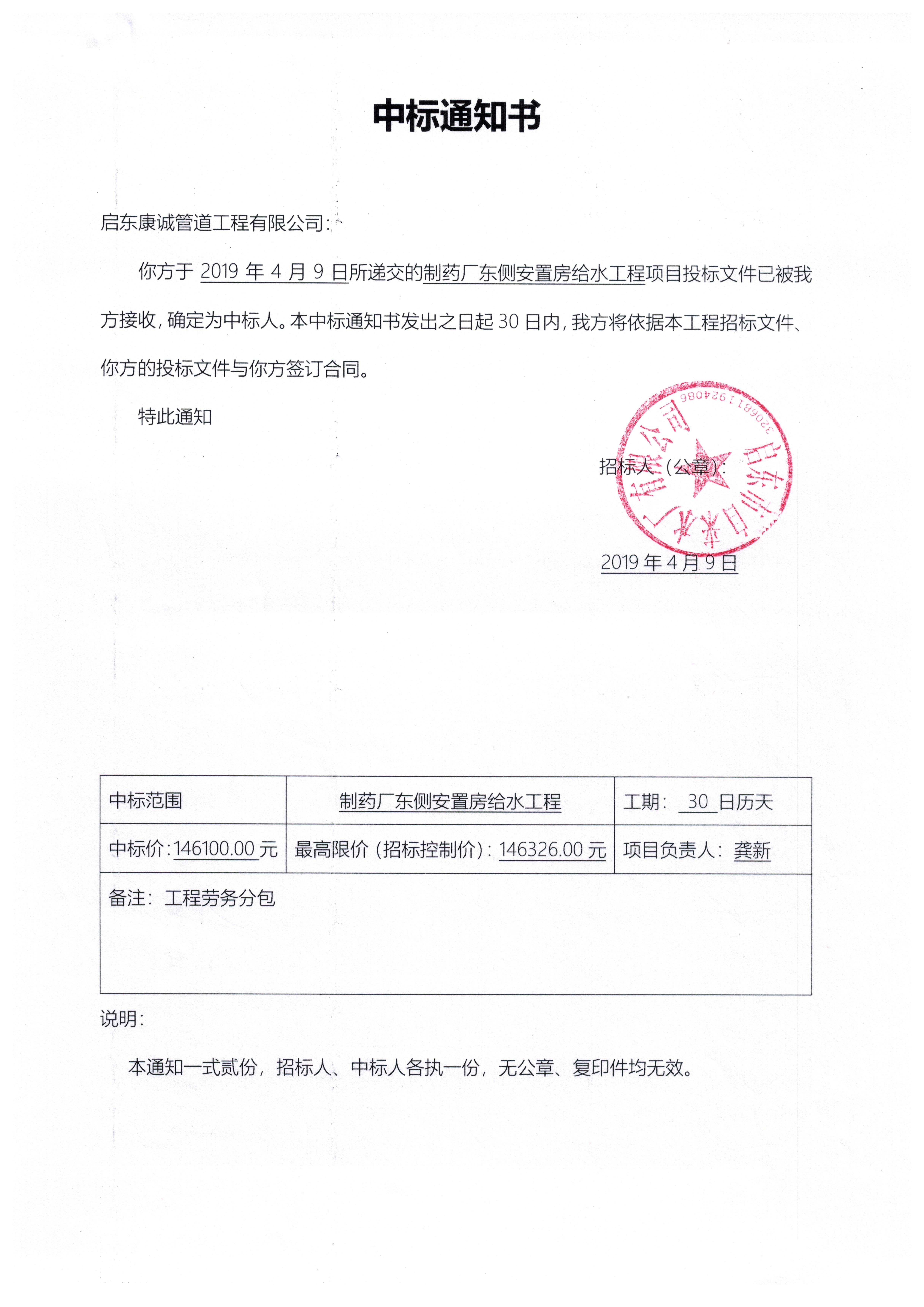 制藥廠東側(cè)安置房給水工程中標(biāo)通知書(shū)